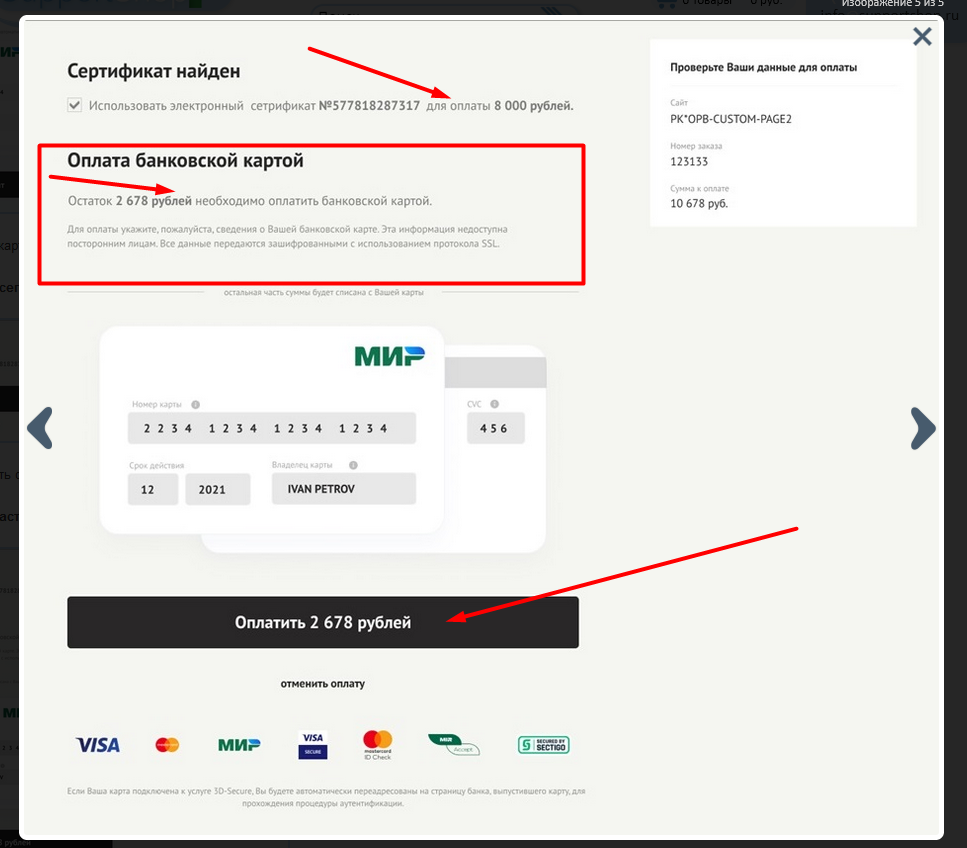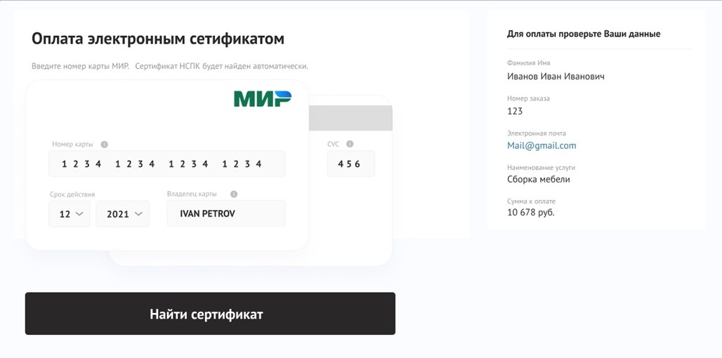 Как только плательщик вводит данные привязанной к сертификату карты МИР, система автоматически находит сертификаты, которыми можно оплатить весь заказ или его часть.